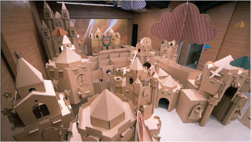 《紙箱城堡》,使用瓦楞紙搭建城堡及迷宮情境,尋常紙箱加上不尋常的創(chuàng)意,也可創(chuàng)作出令人驚喜的空間。體驗(yàn)者可以童話(huà)般的情境中進(jìn)行空間探索,同時(shí)體驗(yàn)者也可利用紙箱、特制小工具和連接件完成立體結(jié)構(gòu)搭建—房屋、盔甲、盾牌等。啟迪體驗(yàn)者建筑結(jié)構(gòu)、立體三維知識(shí)及廢物利用、愛(ài)護(hù)環(huán)境的環(huán)保意識(shí)。
